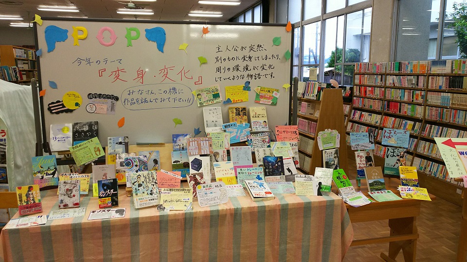 図書館では引き続き、「変身」をテーマに選んだ本とともに図書委員が製作したオリジナルのPOPを展示しています。
