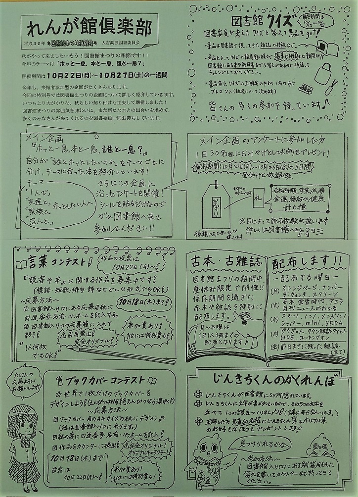 図書館まつりの様子は、ホームページの「フォトアルバム(我ら若人)」で随時紹介していただきましたので、詳細はご覧ください。http://sh.higo.ed.jp/hitoyoshi-z/我ら若人(平成30年度)/