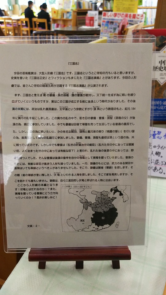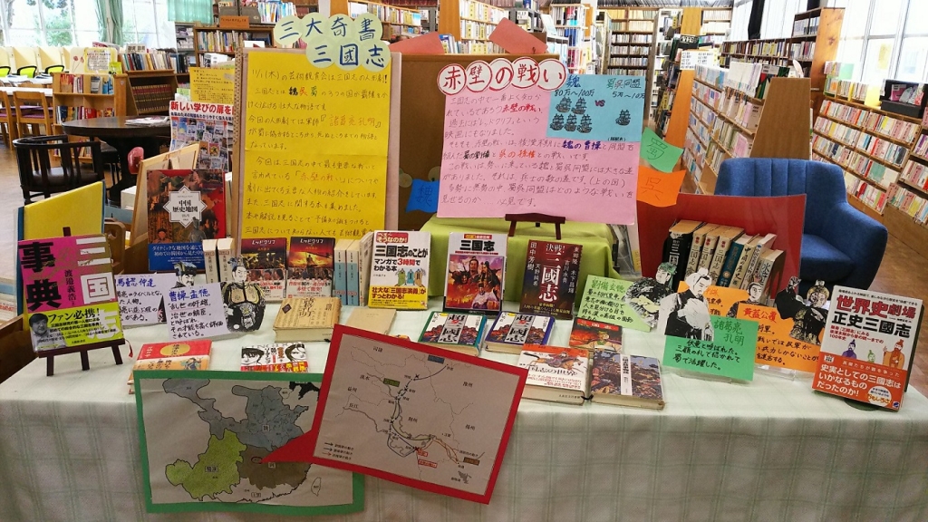 図書館でも1ヶ月前から三国志の特集をしています。関連本を集め、三国志好きの2年生男子生徒による解説資料や人物紹介など、