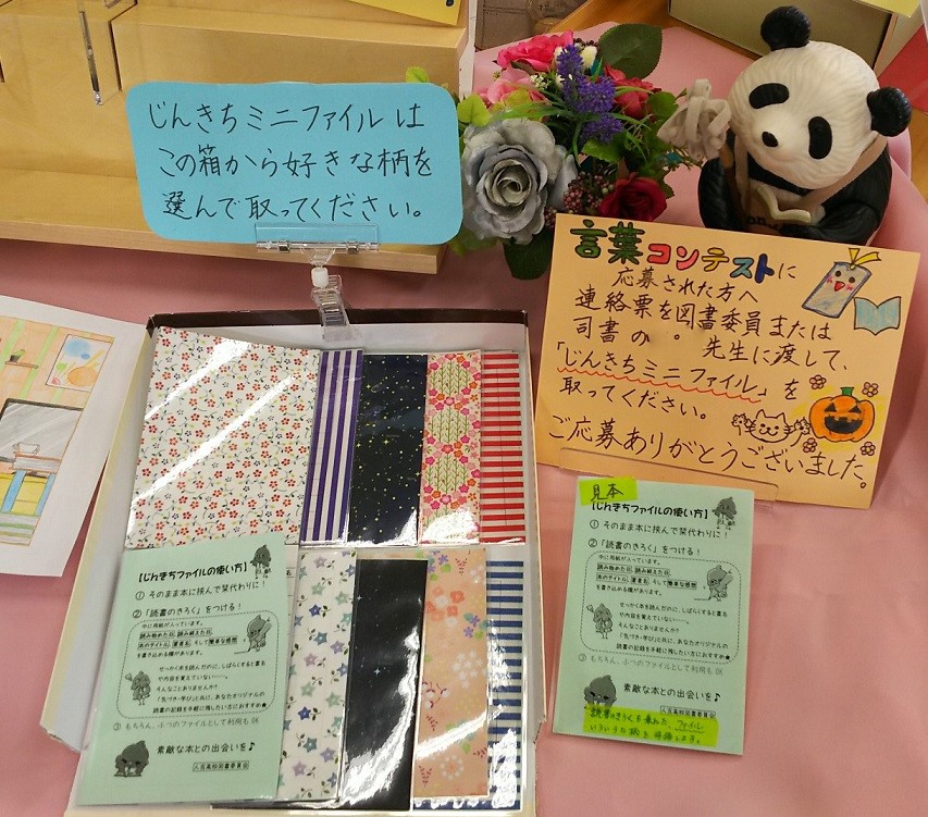 また、作品を応募してくれたみなさんへは、じんきちくんの「読書のきろく」ミニファイルを参加賞として渡しています♪