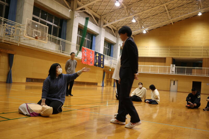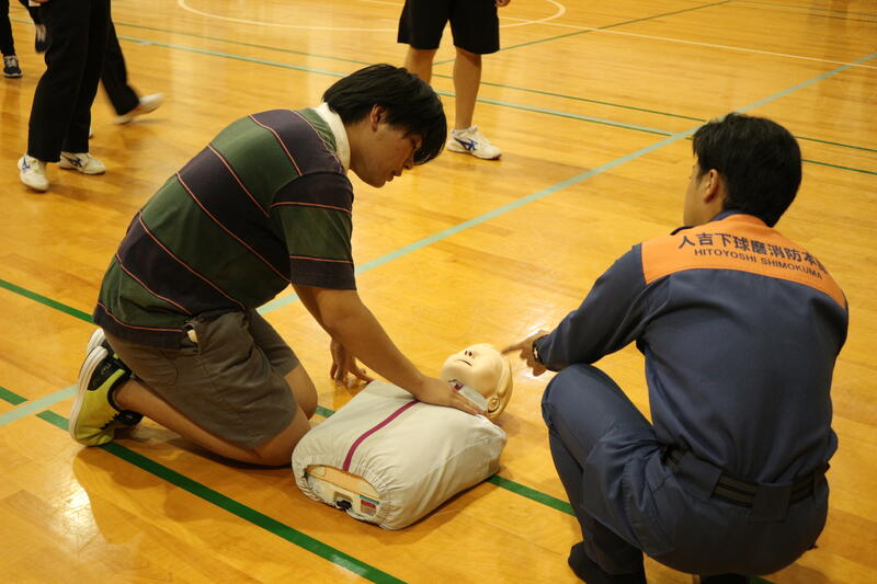 人吉下球磨消防組合より2名の方に来校いただき、胸骨圧迫の方法、AEDの使い方、エピペンの使い方について教えていただいた後、実践練習を行いました。