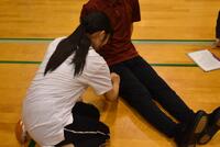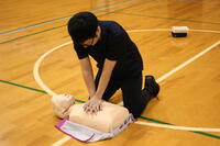 実践練習では、負傷者発見から通報、胸骨圧迫、AEDの使用まで一連の流れを通して行いました。