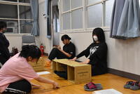 まずはみんなで体育館のシートを敷いて、椅子や机を置きました。