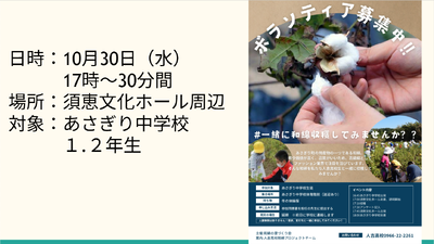 本校の和綿班が昨年に続き、あさぎり中学生にボランティア募集を企画したところ、今年は5名の中学生が参加してくれました。