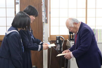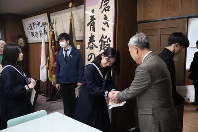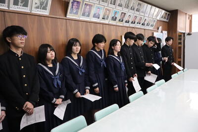1月29日(木)第2回部活動奨励金交付式が行われました。2学期に部活動等で活躍した生徒たちに同窓会から交付されました。今回交付されたのは水泳部、書道部、陸上競技部、放送技術研究部、個人で出場した囲碁です。
