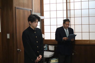 それぞれの出場報告の後、交付が行われ、生徒を代表して水泳部の甲石くんが謝辞を述べ、来年度の活躍を誓っていました。