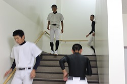 金曜日、6限授業のため、たっぷり練習できるはずが、あいにくの雨。選手たちは、管理棟の階段上りを繰り返していました。気合いが入っています、人高球児たち!