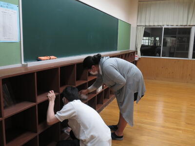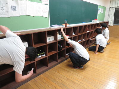 環境ISO宣言の取組の一環として、生徒保健委員会で重点掃除箇所を決め、普段掃除ができない場所を、月に1回クラス全員で清掃する「月1重点掃除の日」を実施しています。7月は棚の雑巾がけを行いました。