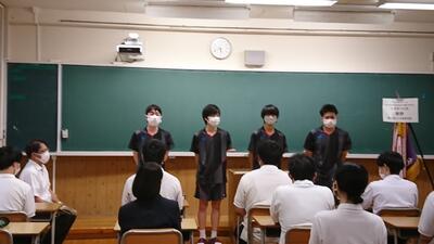 4月13日(火)、写真撮影後、新入生オリエンテーション、対面式、歓迎行事を行いました。対面式では上級生代表による歓迎の言葉、新入生代表挨拶、各学年紹介、生徒会役員紹介、いじめゼロ宣言を行いました。生徒会主催による歓迎行事ではレクリエーションの「人狼ゲーム」で盛り上がり、親睦を深めながら楽しい時間を過ごすことができました。