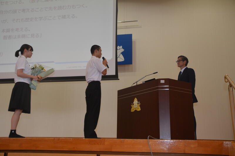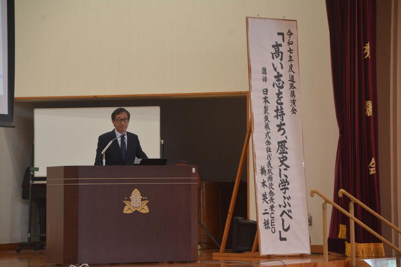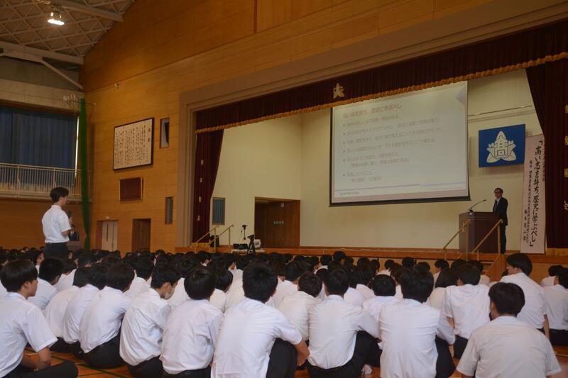 6月13日(金)に本校卒業生(全26期)であり、日本製鉄株式会社代表取締役会長兼CEOの橋本英二様をお迎えし、講演会を開催しました。同窓会や保護者の皆様も多数聴講する中、「高い志を持ち、歴史に学ぶべし」という演題で、ご自身の経験を踏まえ、後輩たちに向けたメッセージを熱く語ってくださいました。質疑応答では多数の生徒の手が挙がり、時間が足りないほどでした。生徒を代表して生徒会長の本田晴人さんが「知識を学ぶだけでなく実績と結果につなげることが大事だと感じました」と御礼の言葉を述べました。