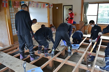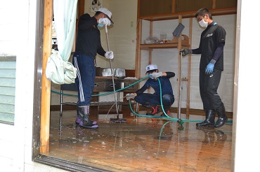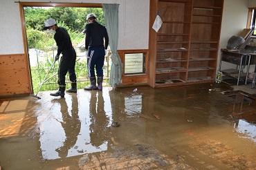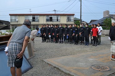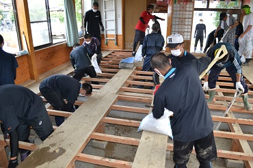 この公民館は、今回の水害で約2m浸水し、館内のイスやテーブル、冷蔵庫や食器棚など、全て水に浸かったそうです。水害後、1か月を経過しましたが、民家の方に先にボランティアさんが入り、また若者も地域におらず、全く手つかずの状態であったそうです。部員達は、午後から約3時間ほどという短い時間でしたが、人の役に立つ喜びを感じながら暑い中、しっかり作業を行いました。