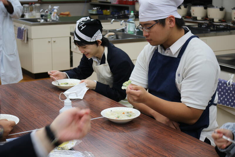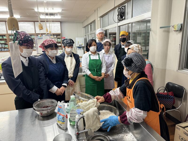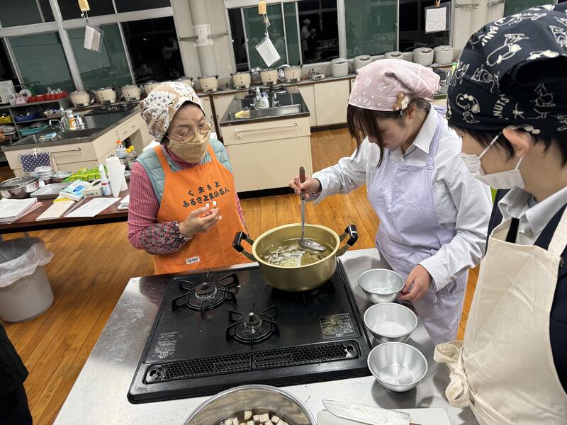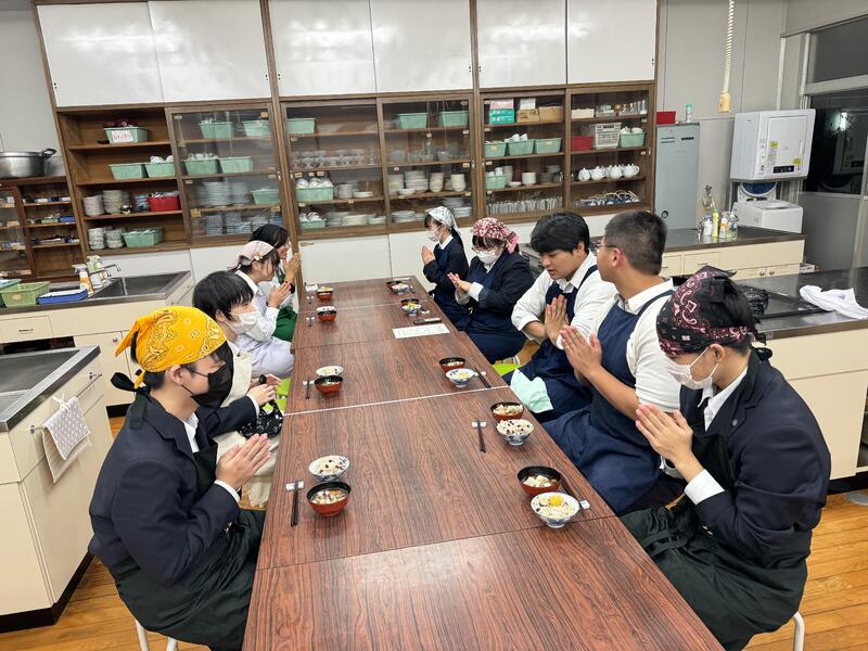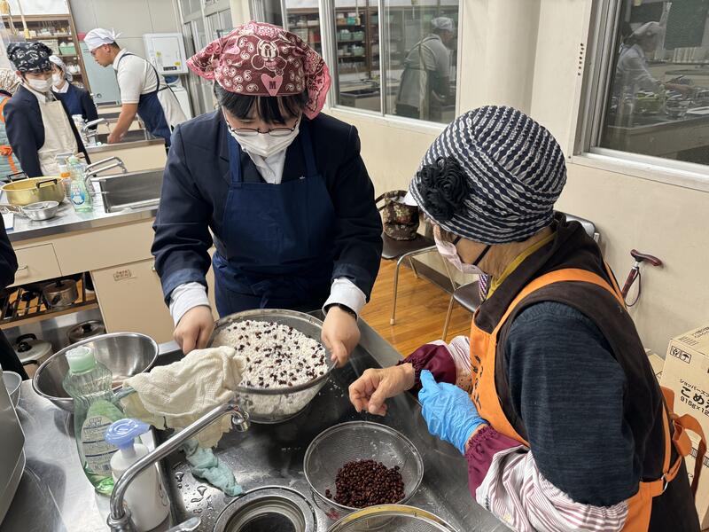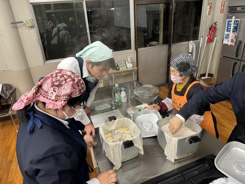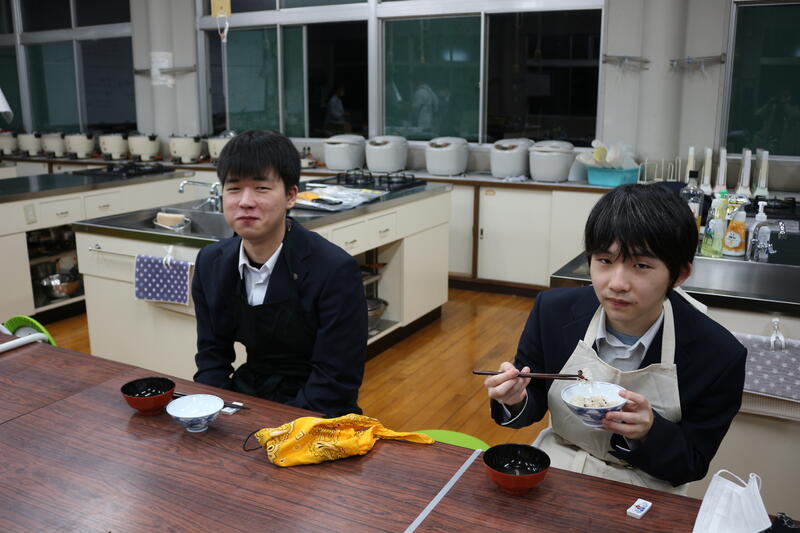 日中も一気に冷え込み、当日の夜は特に寒い中での実習でしたが、出来たての温かい赤飯とつぼん汁を試食し、生徒たちの心も体も暖まったようでした