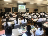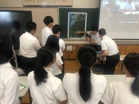 1学年BYHで、令和2年8月に熊本県に新設された「球磨川流域復興局」の取組の一つである「緑の流域治水」に関する出前授業を実施しました。「緑の流域治水」の概要や、洪水発生のメカニズム、治水の取組等について、スライドや立体地図を用いて、分かりやすく説明いただきました。