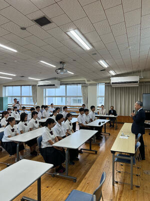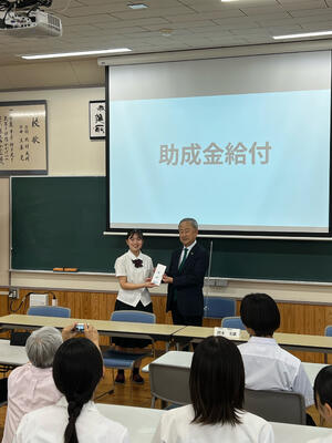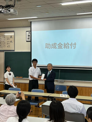 イングリッシュキャンプに参加する21名の生徒に、秀麗会、同窓会そして繊月酒造様より助成金を頂きました。給付式には同窓会理事長の岡本様にご出席いただきました。岡本理事長より参加生徒へ激励の言葉を頂きました。イングリッシュキャンプリーダーの土屋さんと校長先生がそれぞれ謝辞を述べました。本キャンプは7月19日(土)より3泊4日の期間で国立阿蘇青少年交流の家にて実施されます。