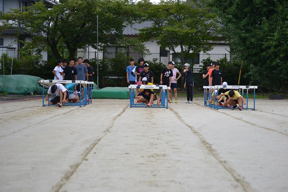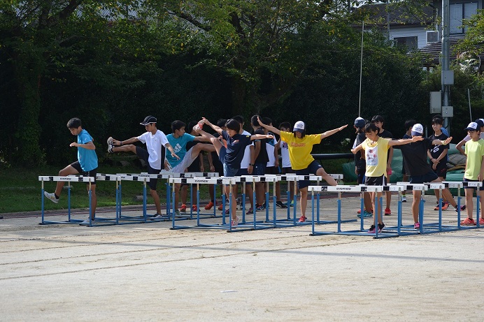 暑さを避け、朝7時30分から練習しています。長距離の選手も、短距離の選手も一緒に体幹を鍛える基礎練習から始まりました。、その後ハードルを使った練習が行われていました。(現在、二人の選手は三重のインターハイに出場しています)