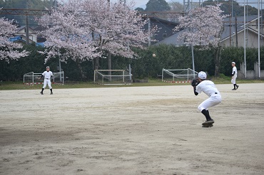 〈野球部〉グラウンドで練習(校庭の桜は満開です!)