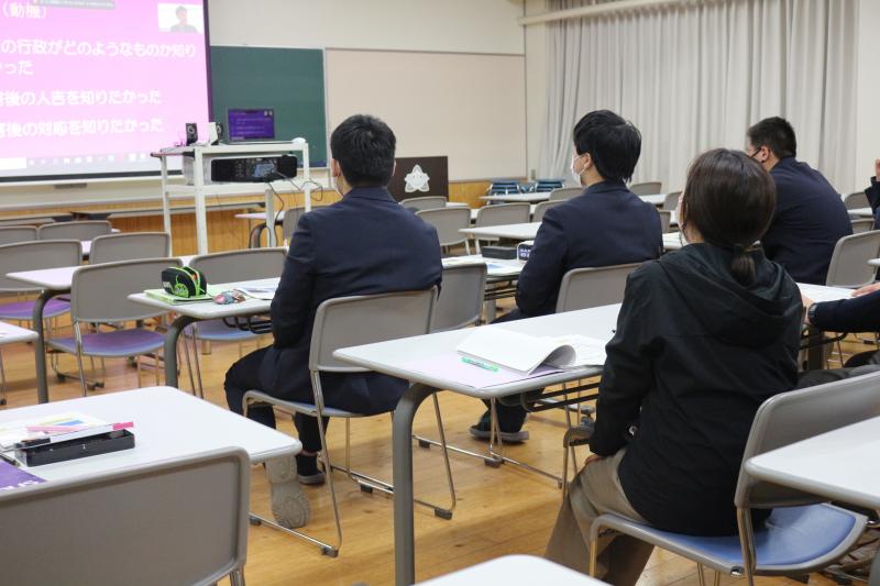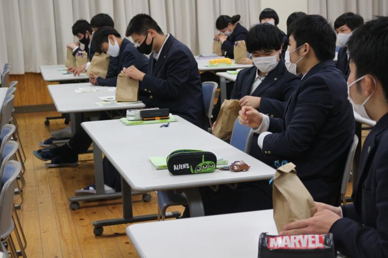 終了後は、教頭先生から活動への労いと賞賛がありました。多くの生徒が、水俣高校の発表に見習うべき事をたくさん感じて、次年度への意欲がわいてきたようでした。その後は、サプライズでお土産が配られました。それは、長崎県鳴滝高校定時制から頂いた義援金で買った、訪れる予定だった芦北・津奈木のお土産でした。義援金で被災地のものを買って、楽しく味わうという、支援と支援を「繋ぐ」ものでした。
