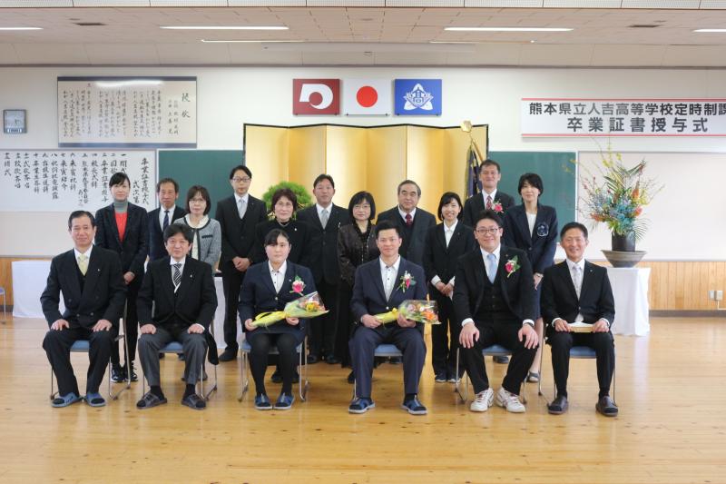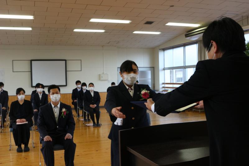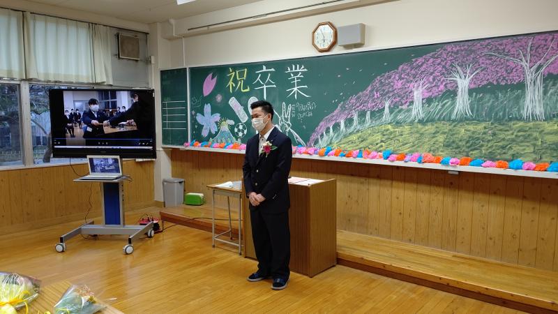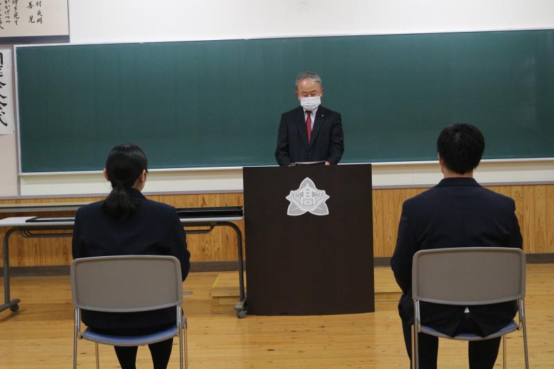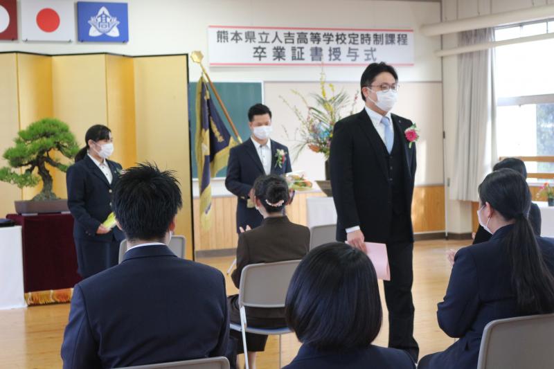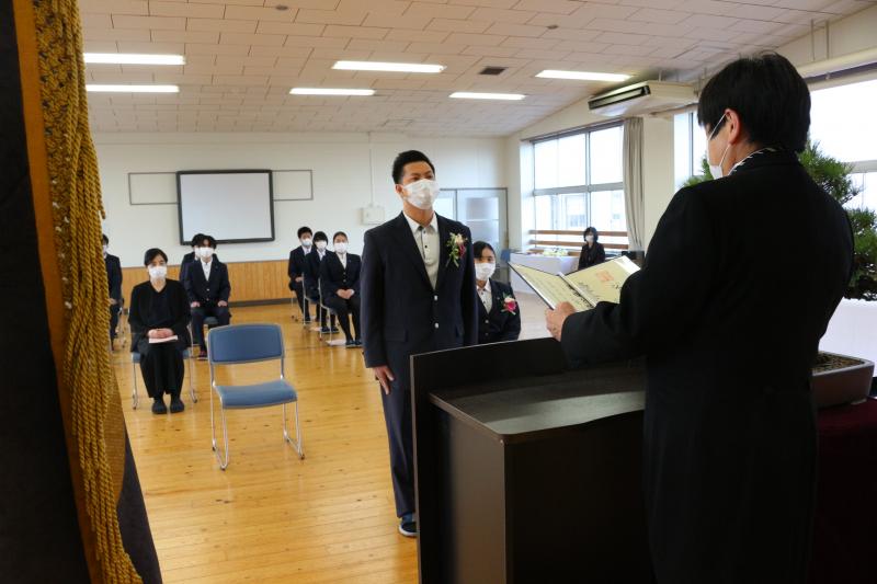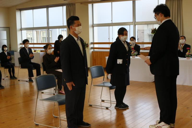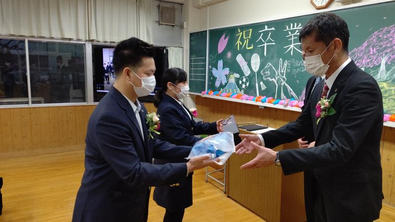 第72回人吉高校定時制課程卒業証書授与式が本校視聴覚教室で行われました。4年生のジャイレック・クリッサターくん、そして西朝華音さんが光永校長から証書を授与されました。コロナ禍のため来賓なしで行われましたが、感動的な式となり、職員・保護者、在校生みんなで二人の卒業を祝福しました。二人とも4年間、皆勤で登校し、特別皆勤賞を受賞しました。定時制の卒業式は、格別です。