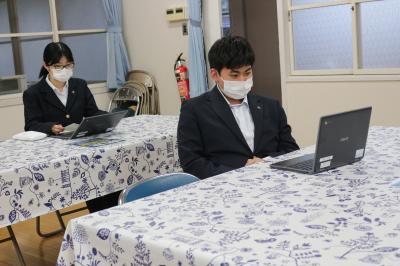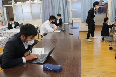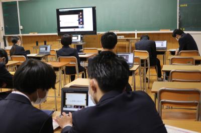 4月30日(金)に1人1台端末を活用して総合的な学習(探究)の時間のオリエンテーションを行いました。2学年毎に2会場に分かれ、職員室からリモート形式で今年度の計画・内容について説明がありました。最後は人吉球磨に関するクイズが出題され、生徒達はチャット機能を使って回答することで、地元理解を深めました。
