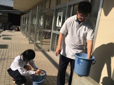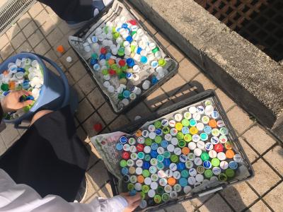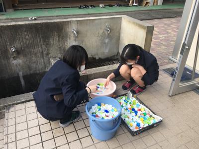 5月12日から14日の3日間、エコキャップ運動で集まったペットボトルキャップの洗浄作業をしました。生徒会役員と有志の生徒達が協力して頑張っていました。計量すると、約19㎏もありました。