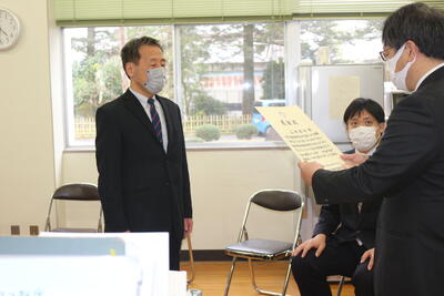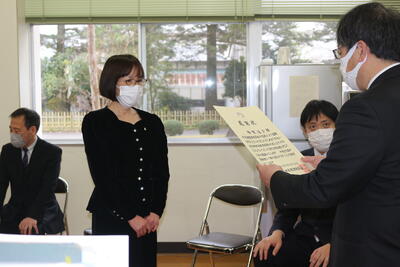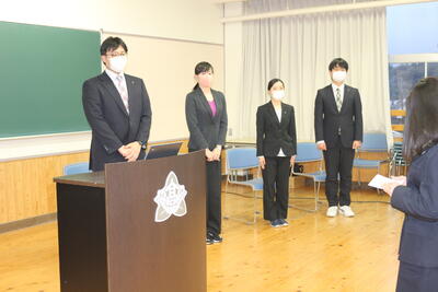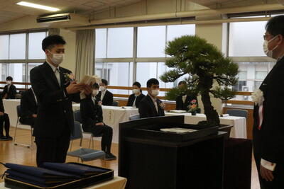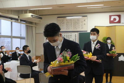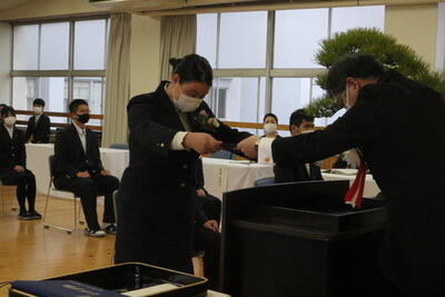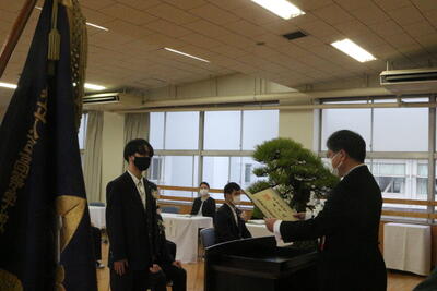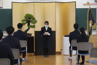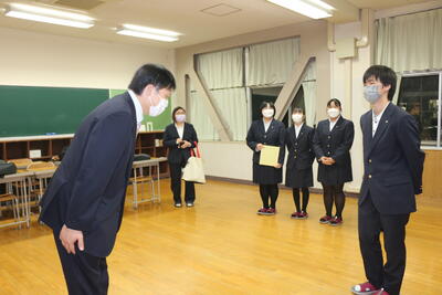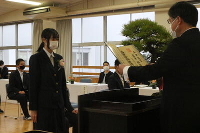 後期表彰式:1カ年皆勤賞・・・3年川瀬さん、1カ年精勤賞・・・1年高橋さん・西さん、成績優秀賞・・・1年高橋さん・西さん