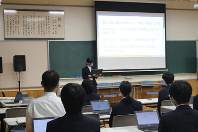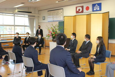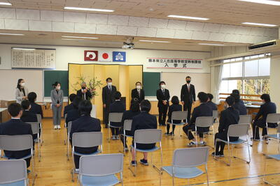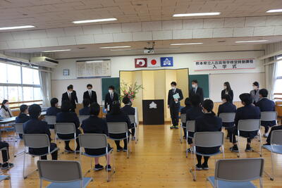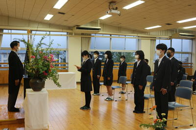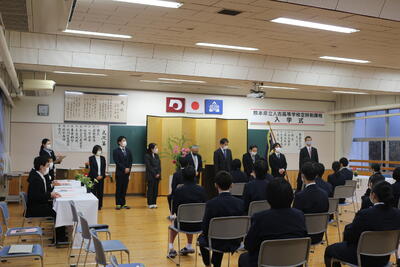 定時制は新入生7名が入学しました。中川校長先生は式辞で「礼節・勤労・進取の教育綱領の精神を体現できるよう有意義に過ごし、郷土への熱い思いを持った未来の創り手として活躍できる力を身につけ本校を巣立ってほしい」と述べられ、新入生代表の東さんが「授業や学校行事を通して夢や希望を見つけ、実現に向けて努力を続けることを誓います」と宣誓を行いました。