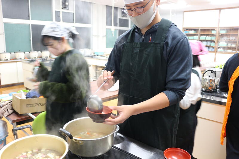 今回来校いただいた講師の先生方は人吉球磨地域にお住まいだったこともあり、普段地域の方と交流する機会の少ない生徒たちは、赤飯が炊きあがる時間やつぼん汁が煮える時間を利用して、講師の先生方に質問をして会話を楽しんでいました。