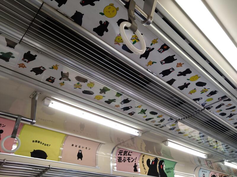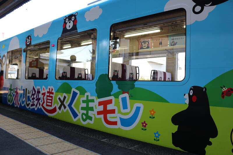 なんと私たちを出迎えてくれた列車は、くまモンとコラボしたラッピング車両でした(車両の中もくまモンがいっぱいでした