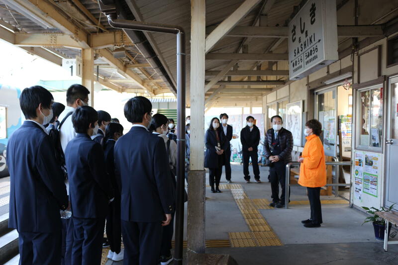 途中、芦北町にある佐敷駅で一度降車し、駅員さんから被災したときの様子や復興の取り組みなどを聞きました。