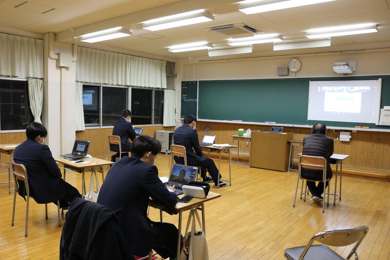 11月の人権教育LHRで視聴したDVDに出演されていた岡本工介さんとリモートを繋ぎ、【「差別をなくす」から「手をつなぐ」へールーツを大切に生きる】を演題に、学生時代の経験や部落問題の歴史・今について講演していただきました。