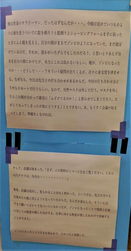 文芸部は図書館前で展示をしています。「英文オリジナル訳」「あいうえお作文」「写真で一話」の三つです。