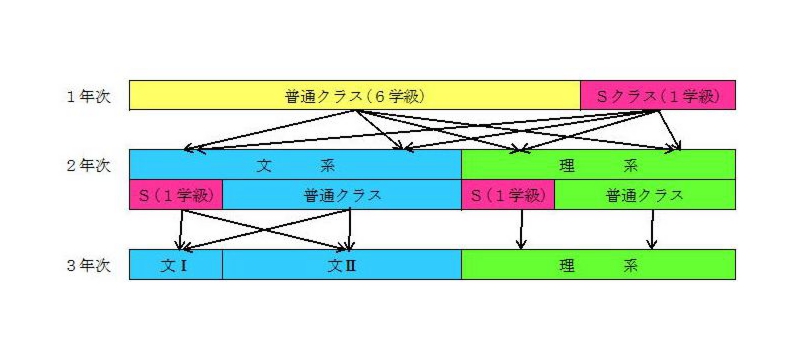 成績上位者の中からSクラスを1クラス編成する。2年次ではこのクラスの生徒を核に普通クラスの成績上位者で文系、