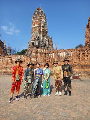 タイ研修5日目(最終日)スタートです。今日は朝からロッブリー農工高等専門学校の農場を視察しました。日本とは違うものが多く、驚いてばかりです。ロッブリーの生徒たちに説明していただきながら、交流も深めました。また、アユタヤ遺跡を視察しました。現地の民族衣装を着ることができ、とても思い出に残りました。この研修で学んだことを今後に活かしていきたいです。