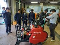 JA経済連の方々が本校に来校され、自走式ラジコン動噴の贈呈式が行われました。園芸科2年生の果樹専攻生が贈呈式に出席し、一人一人が感謝の言葉を述べました。贈呈式の後、機械の操作方法などについて説明をしていただきました。エンジン始動などの操作がリモコンで遠隔操作可能など、最新の機械にみんな興味津々でした。大切に使わせていただきます。ありがとうございました!!