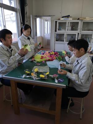 明日の卒業式で3年生の胸に飾るコサージュとテーブルなどに装飾するフラワーアレンジを園芸科学科1年生で