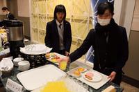 今日の朝食はバイキング形式です。モリモリ食べて、午後のスキー研修に備えよう!