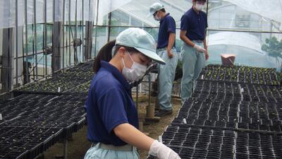 一坪農園の管理をした後に、園芸科学科の草花専攻に指導してもらいながら、シクラメンの葉組の実習をしました。