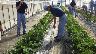 先生から定植の細かい注意を受けた後、一人2本定植しました。ビニルハウスの中やマルチング表面は暑いくらいになっていましたが、土の中は灌水もしてあり、ほんのり暖かい程度でした。淺植えになるようにしっかりポリポットで深さを測りながら優しく定植しました。