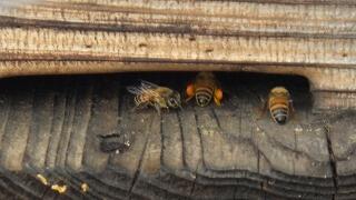 イチゴのハウスは白いかわいい花が咲き、気が早いイチゴは赤く色づいています。受粉してくれているのは働き者のミツバチです。足にいっぱい花粉を付けて巣箱と花を往復しています。
