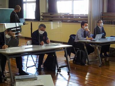コロナ感染対策で、間を空けて体育館に整列しました。扉も全開です!