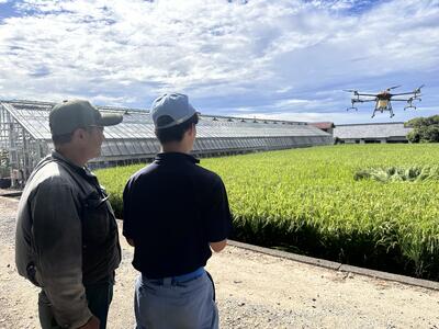 有限会社ミドリの上原様にご来校いただき、本校の水田にドローンを用いての農薬散布を実施しました。