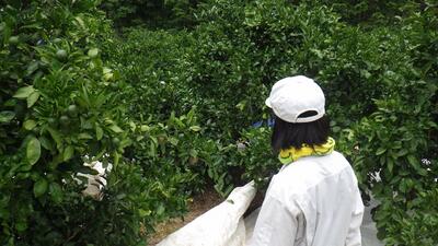 35度を超える猛暑となり、少し曇るだけでもありがたいと思える果樹園で肥のあかり(極早生温州ミカン)の第1回目の摘果をしました。