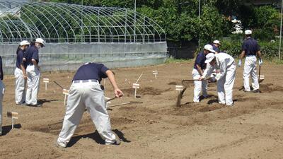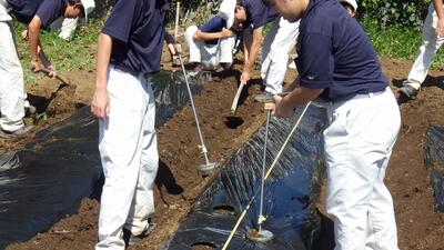 野菜専攻では鍬を使ってみんなでイチゴの高畝を作りました。