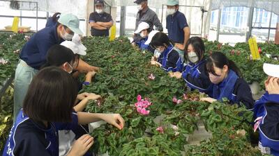 10月21日(金)にシクラメン栽培について熊本県立農業大学校と県下の農業高校11校による遠隔授業がありました。今回は、各学校のシクラメンの葉数(葉の数)を数え、葉組の状態などを比較して意見を出し合いました。本校からは3年園芸科学科草花専攻生4名(安藤諒・船津蒼斗・堀田飛龍・吉田羽純)が参加し、積極的に発言するなど、今後につながる授業内容でした。今後は近い将来、このような授業形式も増えてくると考えると、生徒にとっては良い機会となりました。