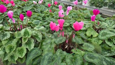 草花専攻はシクラメンの花がそろい始め、花色がわかるようになりました。