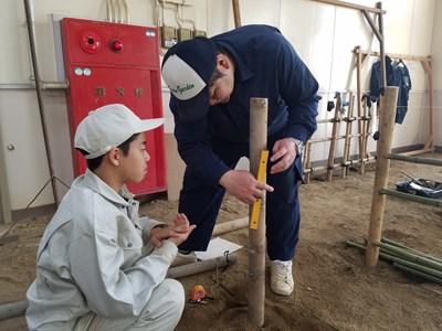 造園科1年生が造園技能検定の資格取得に向けて頑張っています。検定内容は、竹垣や敷石を敷設したり自然石を組んだりと色々な技法があります。