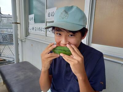 食べることも勉強。来週収穫予定の小玉スイカの試食を行いました。