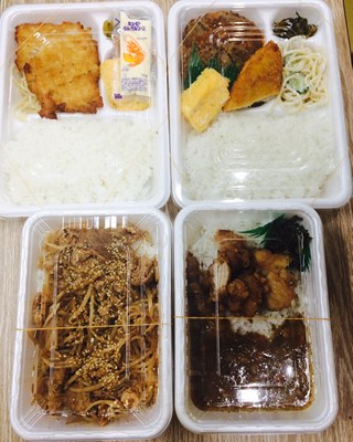 時計回りに左上から日替わり弁当、ハンバーグ弁当、カレー唐揚げ弁当、カルビ弁当(いずれも380円)