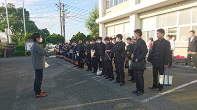 生徒会長2年普通科人文コース 畠田 碧生君から激励の言葉をかけられる生徒達。