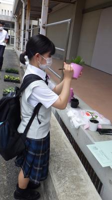 生物活用という科目で栽培している肥後グリーンに、消毒した釘で思い思いに絵や字を描きました。